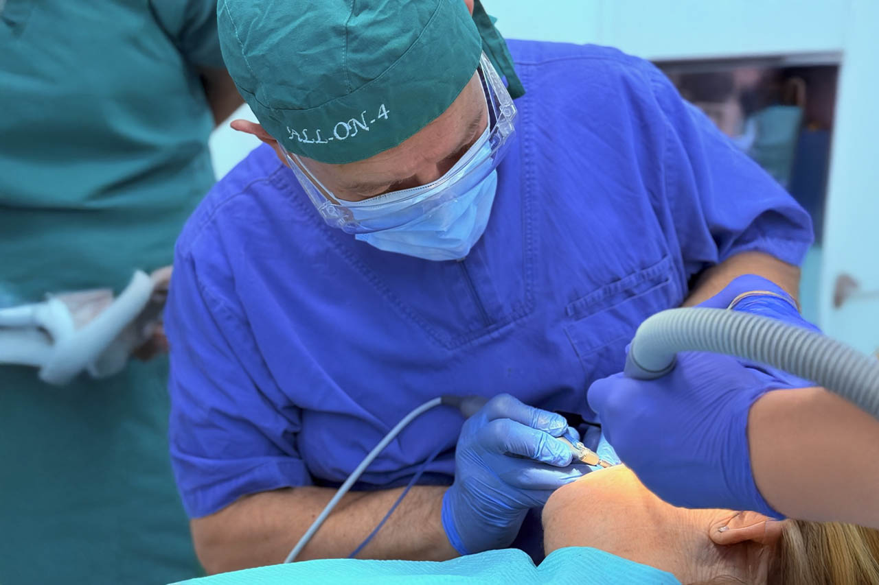 L’impianto e’ una radice artificiale in lega di titanio che viene inserita nell’osso mascellare per reggere uno o più denti mancanti. L’impianto viene inserito mediante l’apertura di un lembo gengivale e l’identificazione visiva dell’osso oppure mediante tecnica transmucosa se c’è indicazione, in particolare se i volumi ossei sono abbondanti. L’osteointegrazione cioè la formazione di osso ad intimo contatto dell’ impianto, determina la resistenza dello stesso ai carichi masticatori, creando un complesso unico impianto-osso assai resistente e duraturo. Sull’impianto viene applicato un moncone chiamato abutment che sostiene il dente artificiale e che può essere in lega di titanio o in metallo bianco cioè lo zirconio, particolarmente indicato nelle zone ad alta valenza estetica . Tale pratica implantare, ormai consolidata e sicura grazie al miglioramento delle tecniche e delle procedure, della forma e della superficie degli impianti, delle connessioni e dei materiali, consente di risparmiare i denti sani adiacenti a quello mancante. Infatti la mancanza di uno o più denti veniva, tempo fa, risolta con protesi rimovibili o limando, quindi riducendo, gli elementi adiacenti per supportare un ponte.