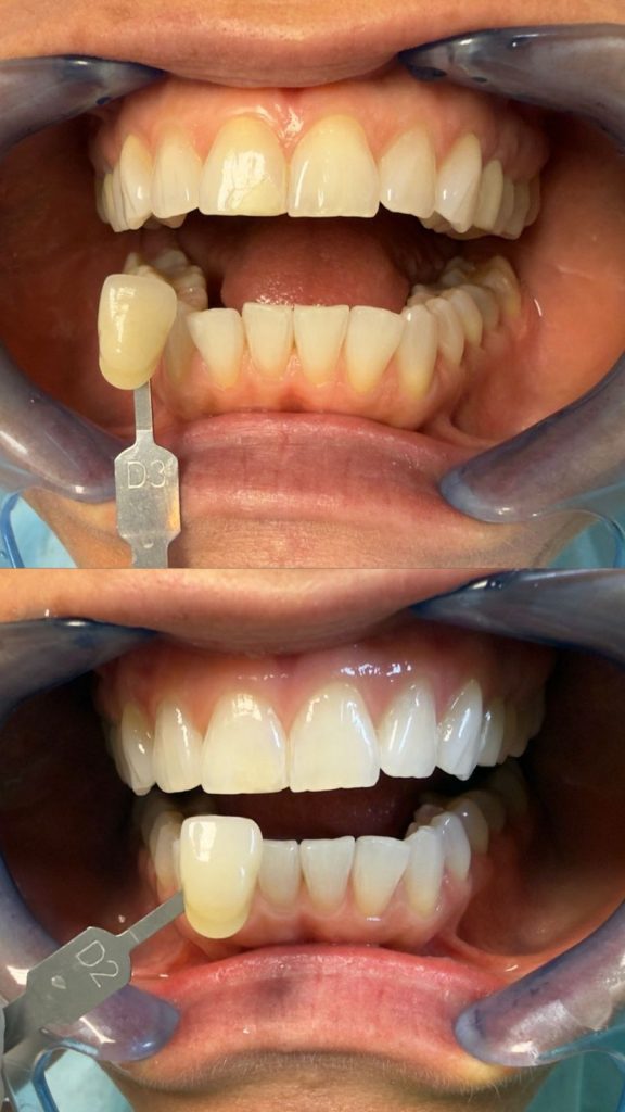 - Sbiancamento alla poltrona (in studio, con lampada LED o laser): risultati visibili in una sola seduta;
